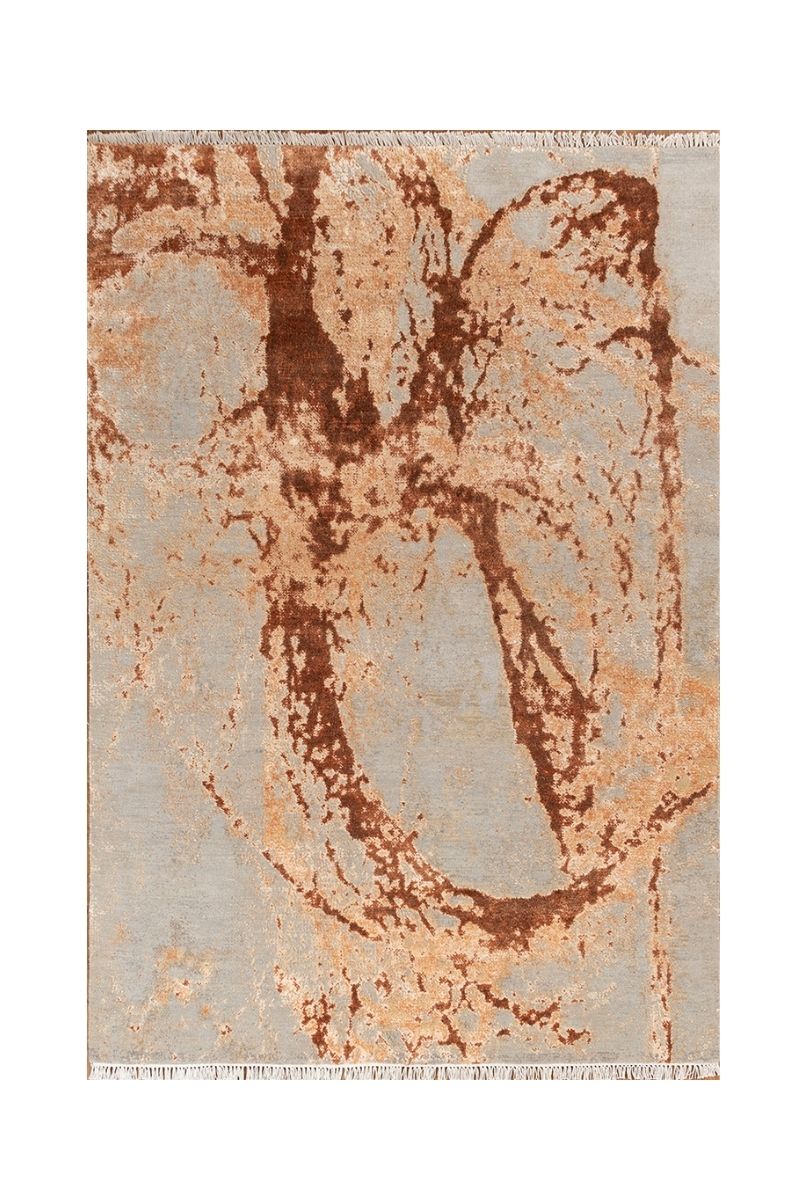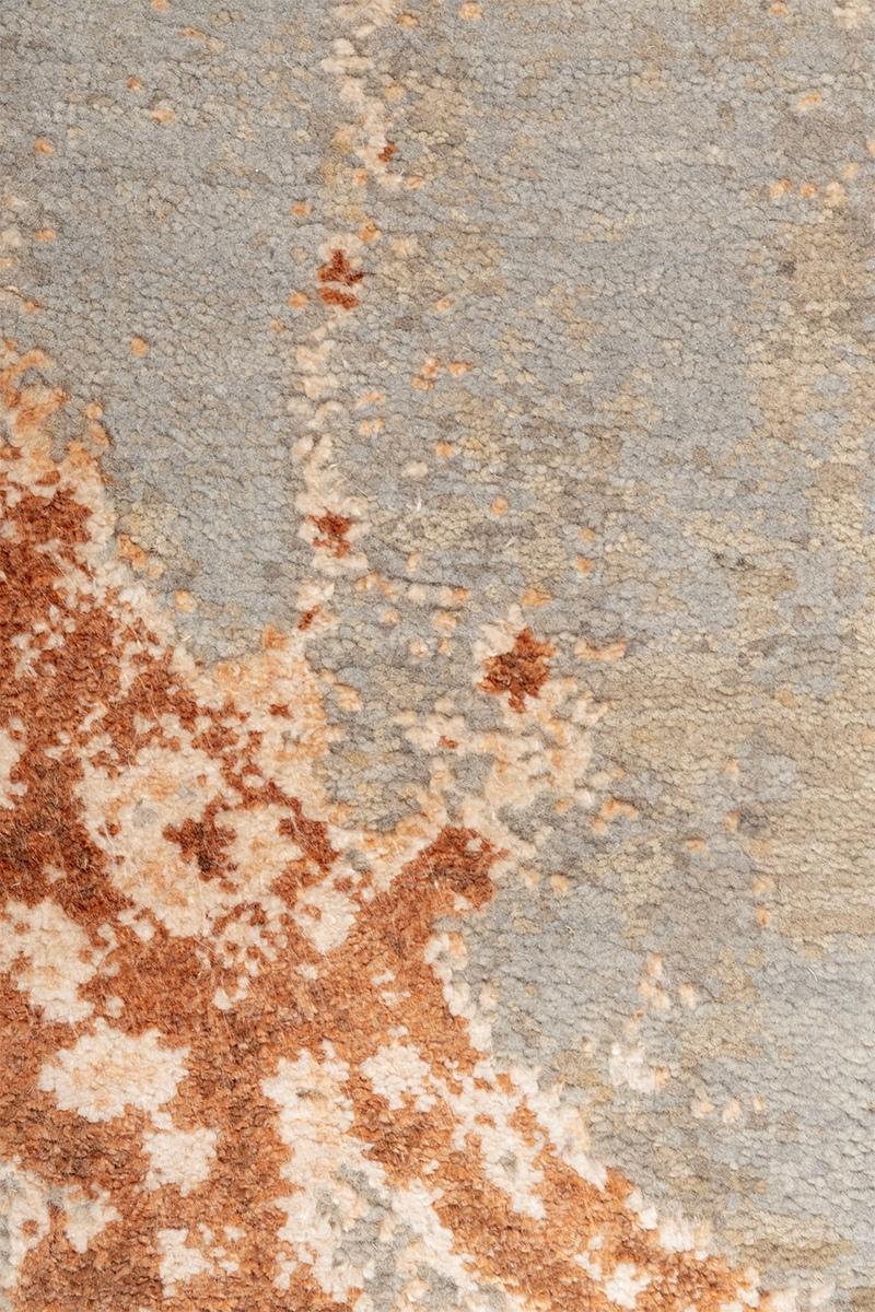 This exquisite hand-knotted carpet features a contemporary abstract design that evokes a sense of organic movement and textural depth. The soft, serene grey-blue field provides a cool backdrop for striking, free-flowing contours rendered in rich, textural shades of russet brown and warm terracotta. These bold, visually distressed lines create an artistic, large-scale motif, suggesting natural forms or ancient script. The contrast between the smooth, cool ground and the granular, warm-toned design results in a sophisticated piece that blends modern minimalism with raw, artistic expression, making it a distinctive focal point for any upscale interior.