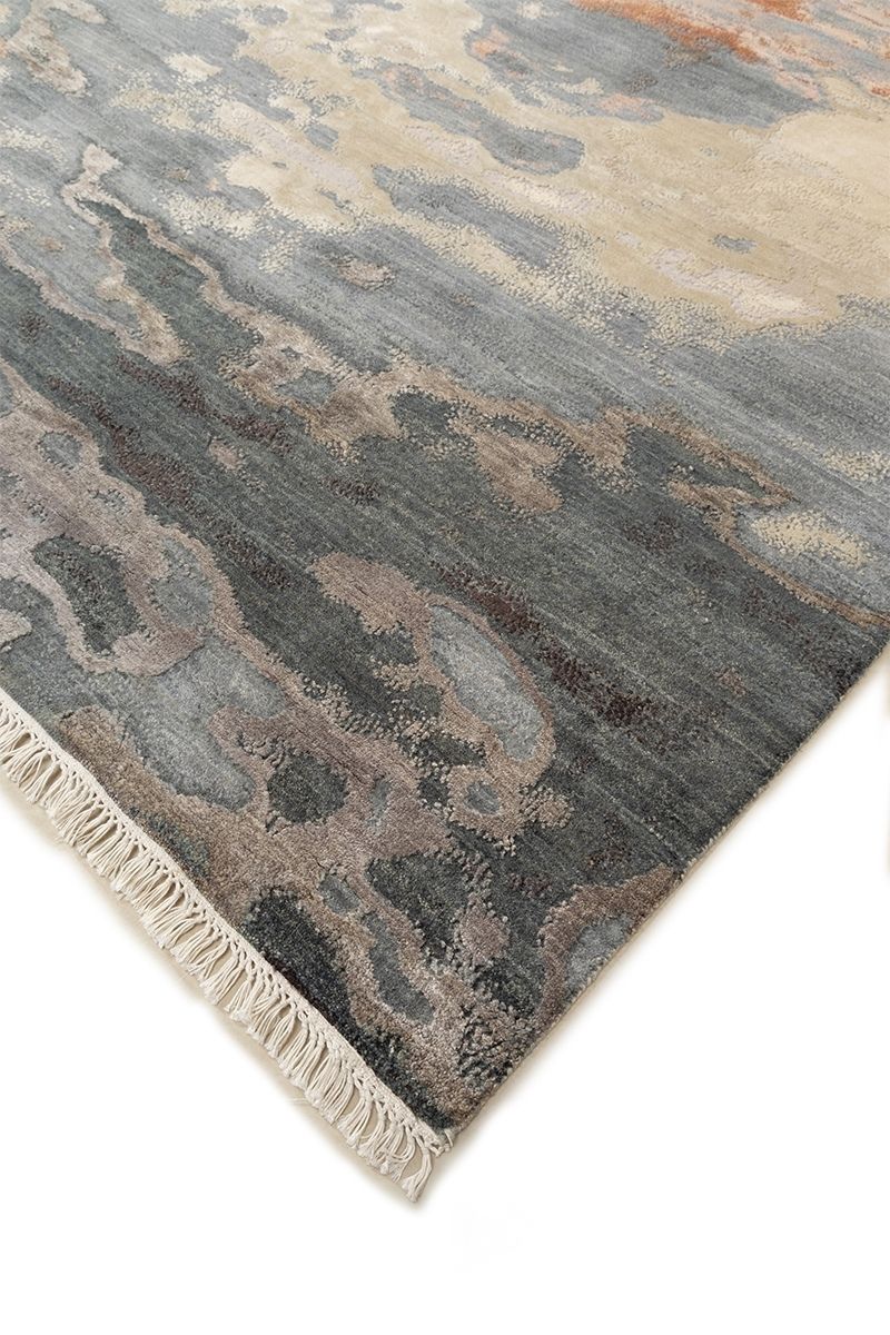 This exquisite hand-knotted carpet presents a captivating abstract landscape, reminiscent of a dramatic, layered skyscape or geological strata. The design employs a sophisticated, earthy palette where fluid, organic shapes in soft cream and pale beige interlace with brooding charcoal, deep slate grey, and striking accents of burnt orange and terracotta. These horizontal, cloud-like forms create a sense of dramatic movement and texture. The masterful interplay of colour and texture in this contemporary composition offers a striking yet harmonious focal point, perfect for adding an artistic and dimensional quality to luxury interiors.
