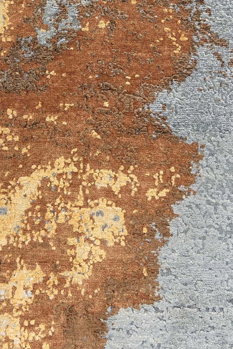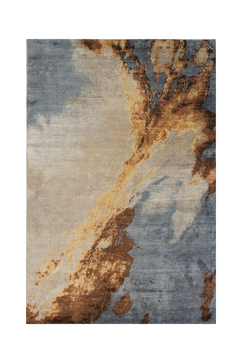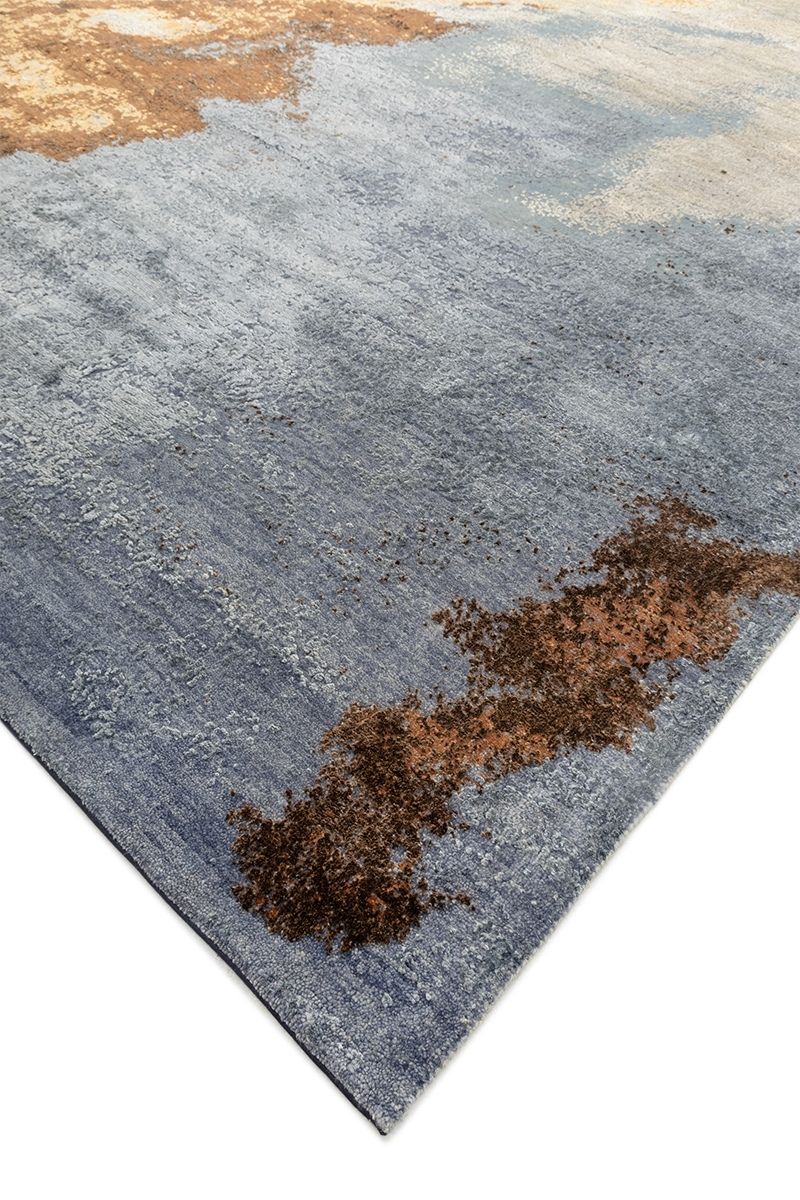 This exquisite hand-knotted carpet features a dramatic, large-scale abstract design that evokes a dynamic, natural phenomenon like rushing water or wind-swept stone. The composition utilizes a sophisticated blend of cool and warm tones, with the field dominated by varying shades of dusty blue-grey and pale sky blue. A powerful, vertical ribbon of colour cuts through the centre, rendered in rich, textural shades of burnt sienna, deep bronze, and vibrant gold, creating a strong, almost geological contrast. The blend of tranquil cool tones and fiery, earthy hues makes this piece a striking, fluid, and artistic focal point for any contemporary luxury setting.