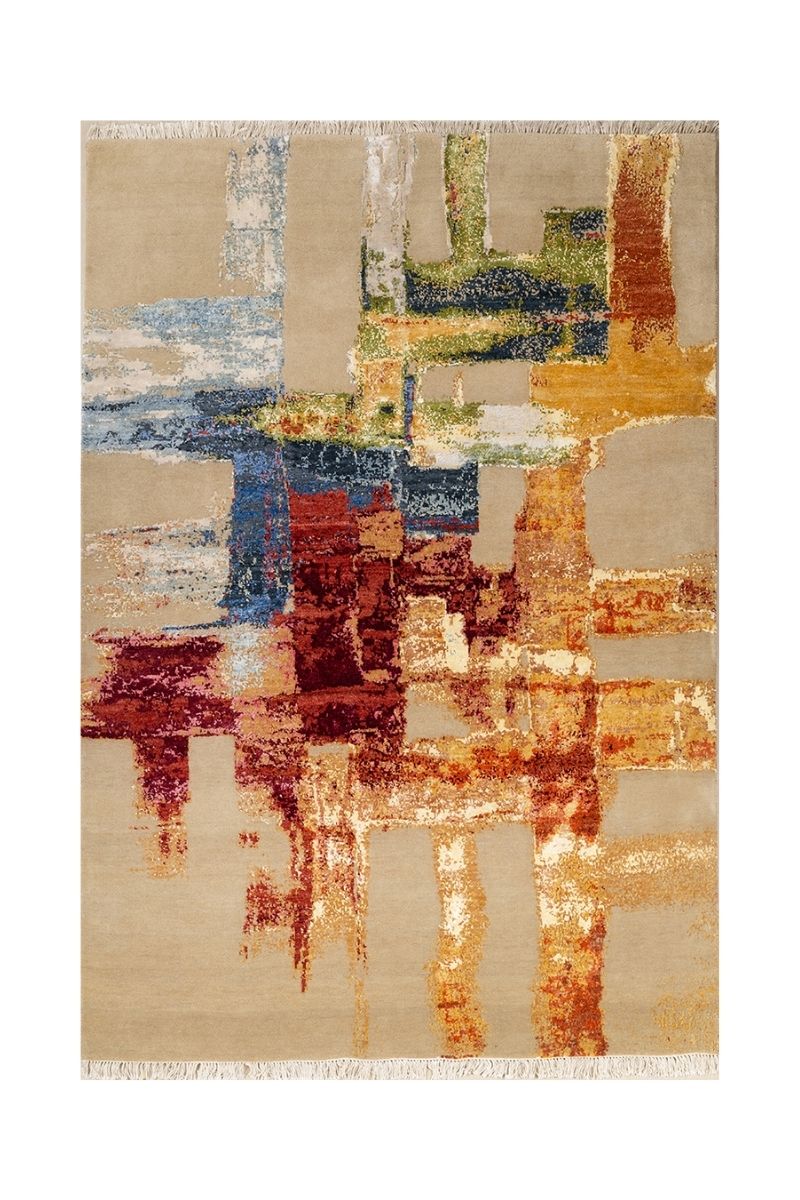This stunning hand-knotted carpet features a vibrant, abstract design that resembles a dynamic, textured oil painting with a lattice structure. The spacious field is a uniform, elegant pale beige and sandy neutral, providing a sophisticated backdrop for the energetic overlay of colour. Bold, intersecting vertical and horizontal strokes are rendered with a painterly, distressed effect in a kaleidoscope of hues, including rich maroon, vibrant primary blue, deep navy, sunny gold, and bursts of lime green. This dramatic yet balanced composition creates a powerful sense of movement and artful complexity, making it an undeniable focal point in any contemporary luxury setting.