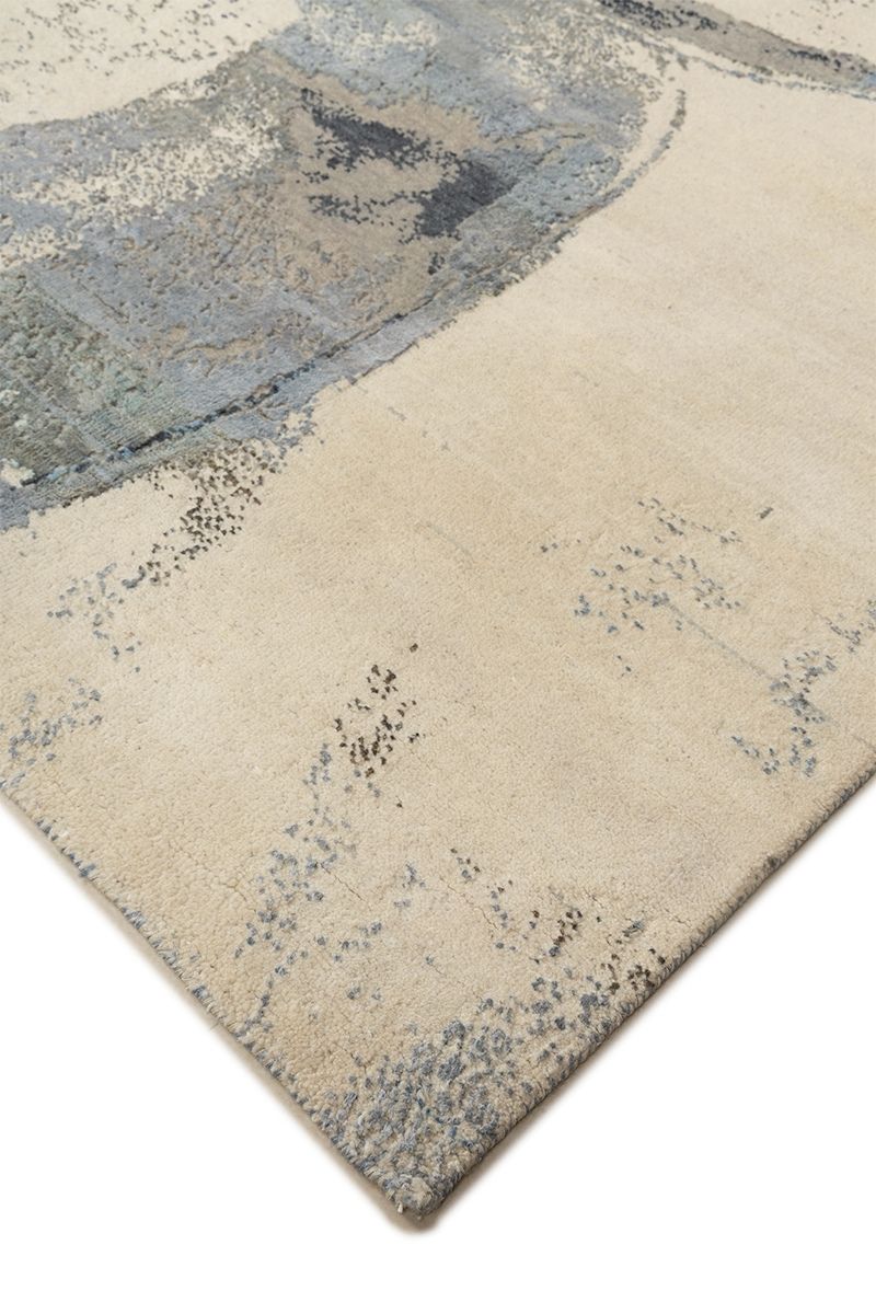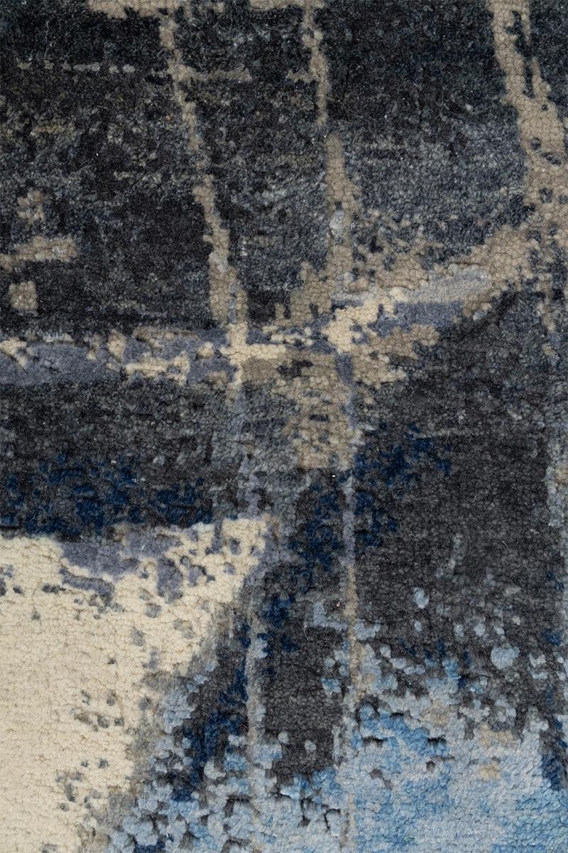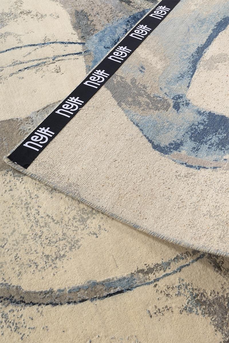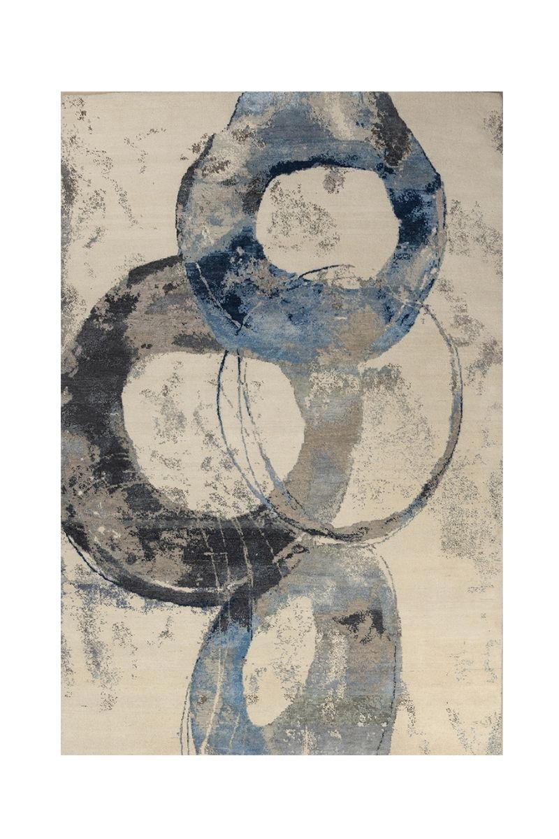 This exceptional hand-knotted carpet features a bold, contemporary abstract design dominated by a cascade of intersecting circles, reminiscent of a dynamic, modern painting. The field is a serene expanse of pale ivory and softest cream, providing a luminous backdrop for the striking graphic elements. The rings are rendered in a sophisticated, cool-toned palette, featuring textured, painterly strokes of deep indigo, varying shades of cobalt blue, and grounded accents of slate grey and charcoal. The composition’s blend of sharp circular forms and distressed, fluid colour application creates a powerful sense of movement and artistic depth, making this piece a stunning focal point for any luxury contemporary space.