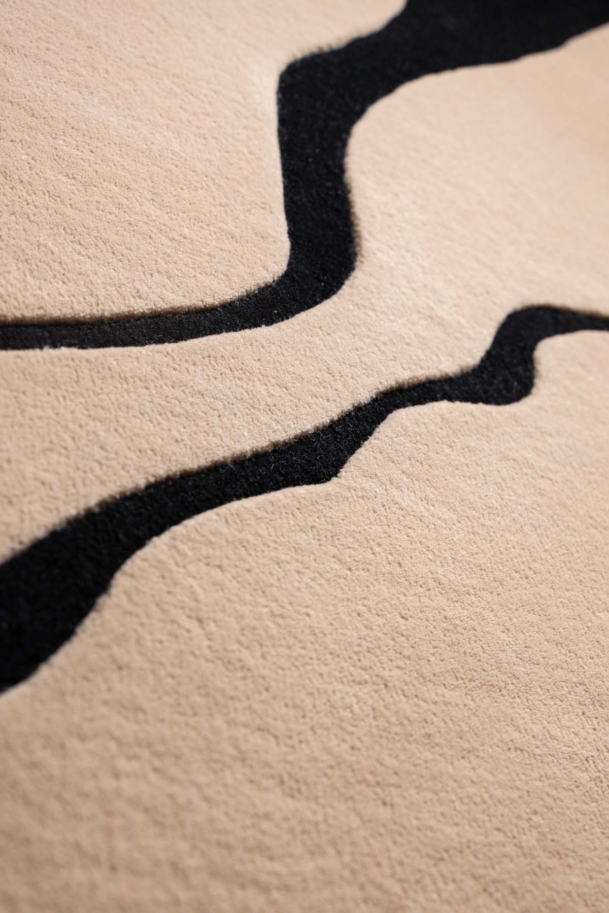 Silent Abyss symbolizes a journey into a vast, uncharted realm—one that is as internal as it is external. It evokes the sensation of slipping into darkness, where familiar forms fade and intuition takes over. The rug’s flowing lines suggest shifting terrains and unseen movements, mirroring the uncertainties of existence and the quiet tension of the unknown. It speaks to a space where silence is expansive, where meaning emerges not from clarity, but from surrendering to what cannot be fully grasped.