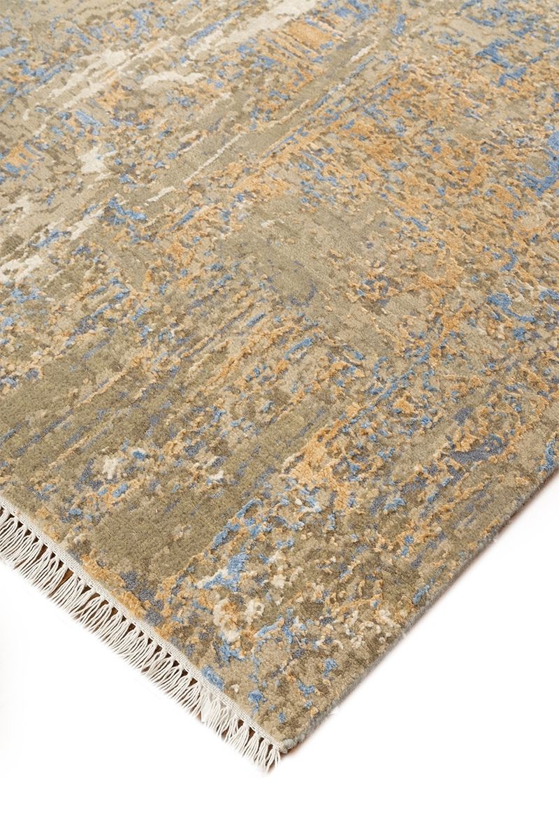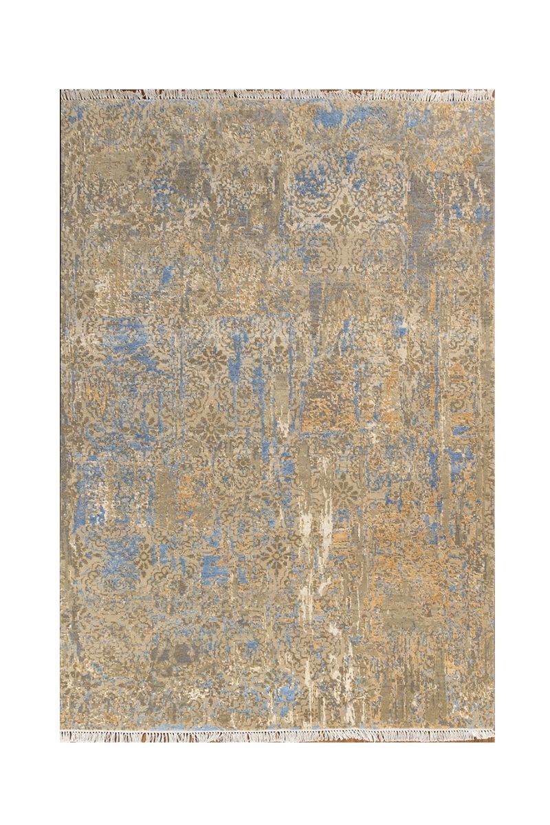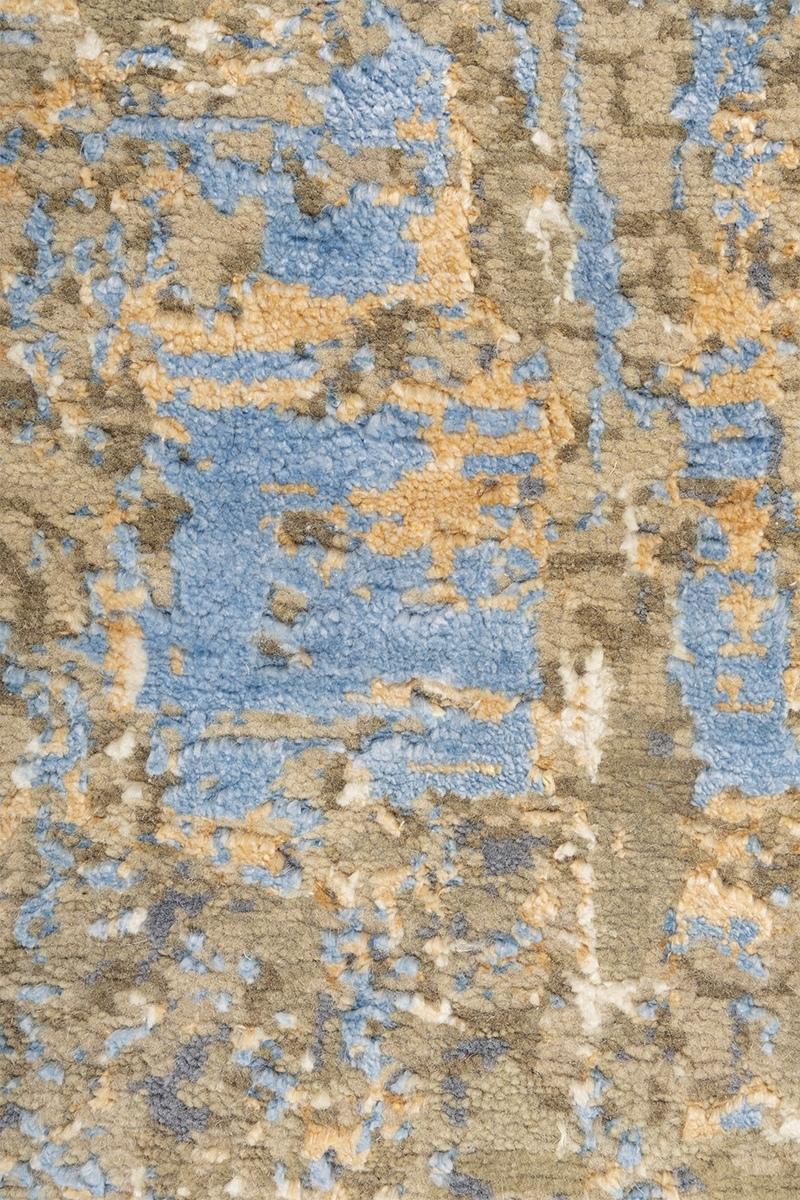 This intricate hand-knotted carpet seamlessly blends traditional floral and medallion motifs with a highly abstract, distressed finish, resulting in a unique transitional design. The overall pattern has a fragmented, faded appearance that mixes subtle taupe and khaki tones with striking, vibrant bursts of electric blue and soft apricot. This complex layering of classic pattern beneath a modern, painterly texture creates an evocative and sophisticated piece, perfect for adding dynamic visual interest and a sense of history to a contemporary space.